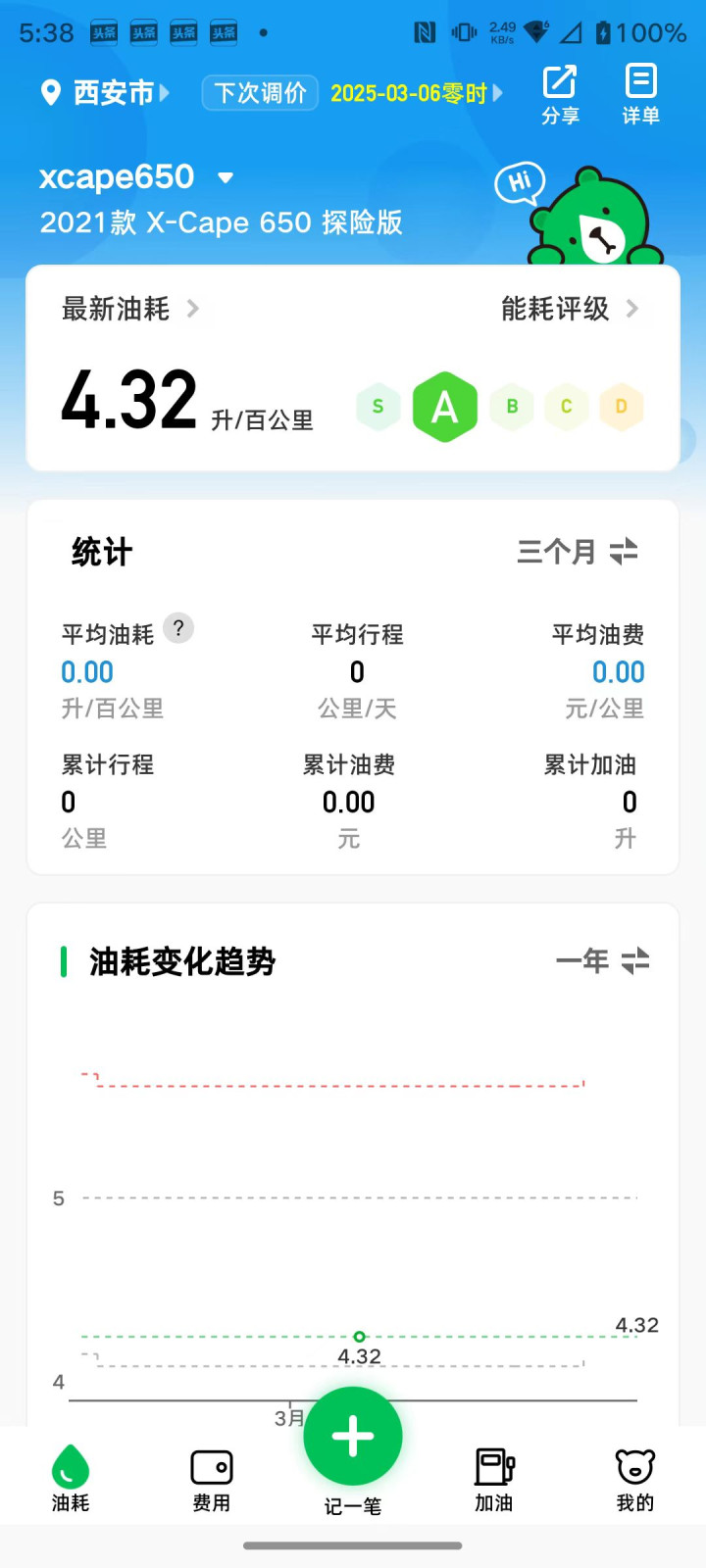 平常加油使用小熊油耗记录,可以看到油耗基本在4.32L/百公里,平常骑行也跟这个数值差不多。