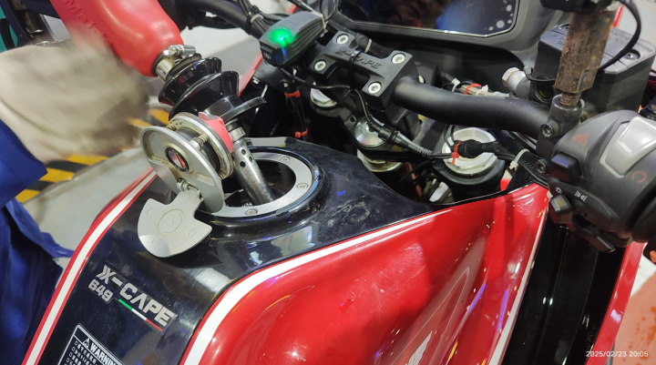 在配置方面,X-Cape 650也是一身名牌。前悬挂采用马祖奇50mm全可调倒置减震(行程160mm),后悬挂为KYB多段可调中置减震(行程150mm),支持复杂路况下的精准调校;制动系统配备Brembo四活塞卡钳+双通道ABS,兼顾制动力与安全性。